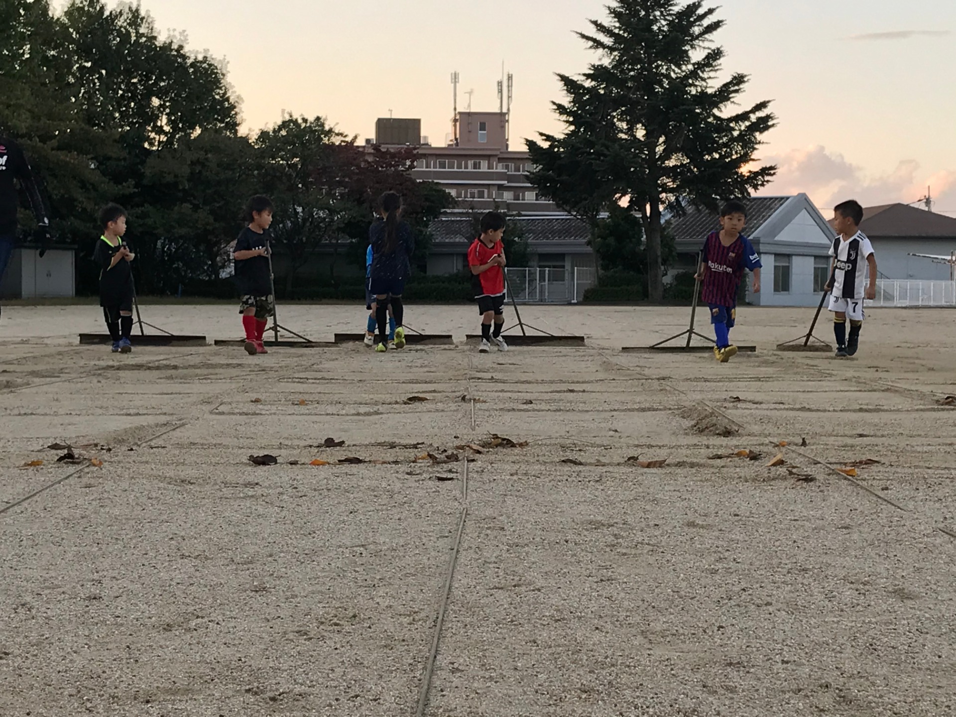 ナイスキッズのモットーは自立した選手を育てる!です。というわけで、小さなキッズさんでも練習後に自分たちの使ったグランドにトンボかけをします。別にキッズさん用のトンボがあるわけではないですよ(笑)大きい重いのをみんなで交代で一生懸命に引くんです。大人がやればすぐに終わるこうした作業も体の小さなキッズさんには大変な作業。ましてや練習後なんて疲れてますからね。でも、どの子もグズらず最後まできちんとやって、体操して、グランドにありがとうございました!と元気よく挨拶をして帰るのです。